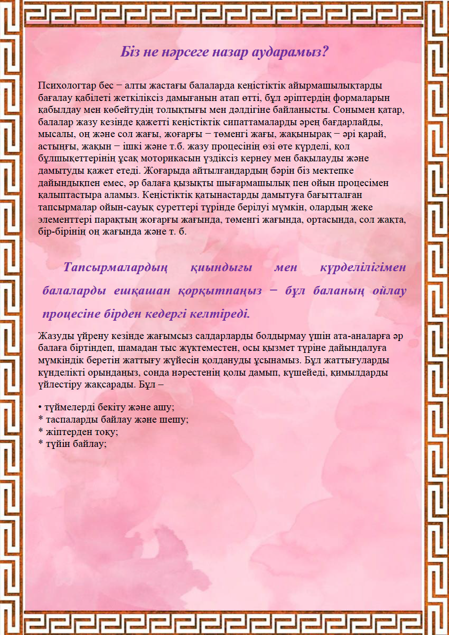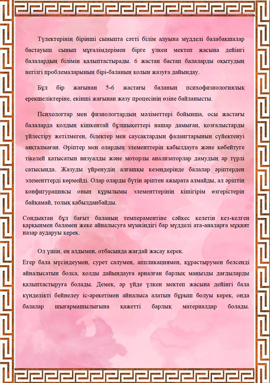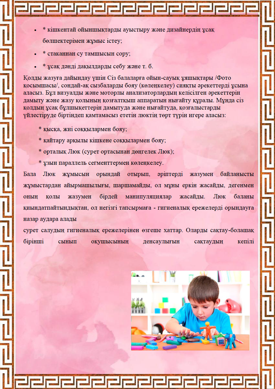 Ата-аналарға кеңес беру. "Ұсақ моториканы дамыту. Қолды жазуға дайындау" » ГККП "Ясли сад №83"